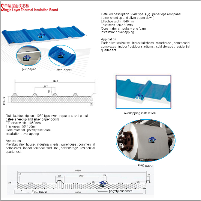 Polystyrene(EPS) sandwich panel is a new type of construction panel which made of outer layer both side of prepainted steel coil and inner layer of polystyrene by computer -controlled color steel shaping machine and covered with high -strength adhesive .The connection can be two ways , one is drilling on the panel and jointing with bolts and nuts , the other is opening groove on the panel and connecting with bolts . Wall panel and roof tile has 50mm , 75mm , 100mm , 125mm , 150mm foam with 0.326mm , 0.376mm , 0.426mm , 0.476mm steel sheet widely use for prefabricated house , construction site , bulidng , warehouse , worker camp , office ect . It is low cost and thermal insulation , waterproof , sound insulation .The fix width of wall panel only has 1150 and 950 mm , 840mm and 1050mm for roof tile , length is no limte but less than 12000mm because of the transportation . The surface metal coat could adopt galvanize aluminum steel sheet , galvanized aluminum zinc color steel sheet and the galvanized color steel sheet .
